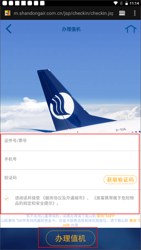 3、然后进入登录界面,输入证件号/票号、手机号、验证码,最后点击办理值机就可以了。