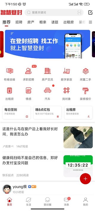 1、下载进入智慧登封,可以看到拥有首页、生活、登封圈、消息、我的五大板块;