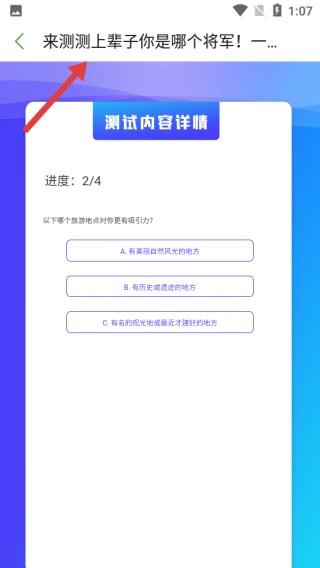 3、点前世今生测试界面,标题为测上辈子是哪个将军,显示进度为2/4,有一道测试题目。