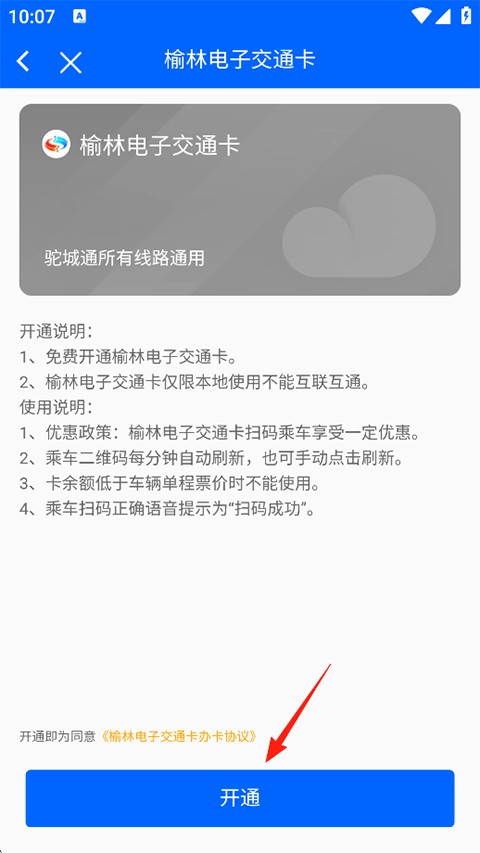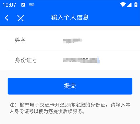 3、输入姓名及身份证号后点击提交以开通电子交通卡;