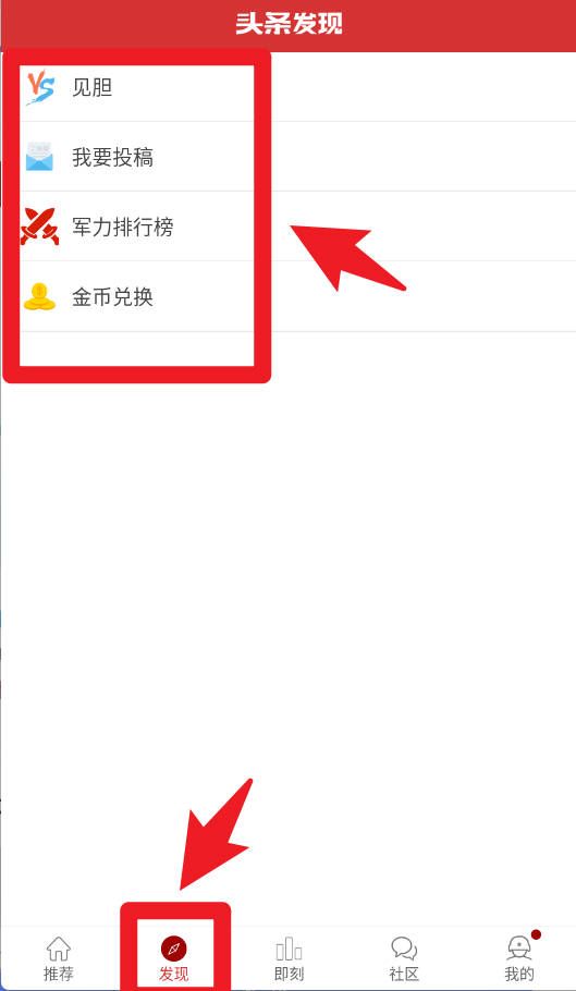 3、发现页面提供见胆、我要投稿、军力排行榜及金币兑换等功能,方便用户互动参与并查看军事数据排行。