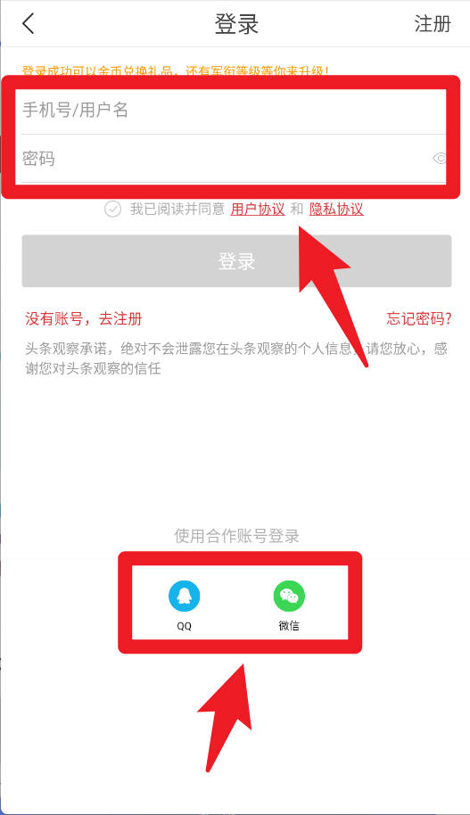 1、登录页面支持手机号或用户名加密码的方式进入,同时可选择QQ或微信合作账号快捷登录,需勾选用户协议与隐私协议。