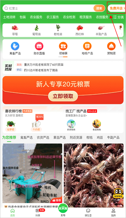 如果您想通过平台销售农产品,请您先点击惠农网app首页右上角"去开店(去卖货)--店铺管理"开通店铺。