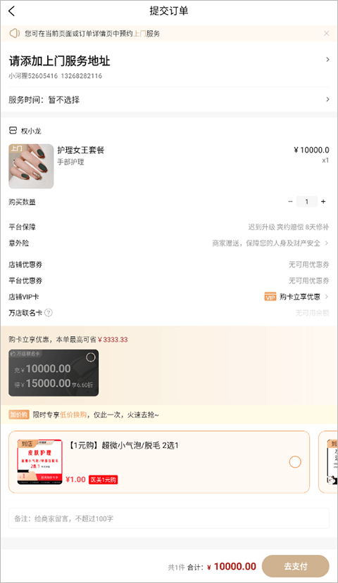 4、在提交订单页添加你的上门服务地址,支付成功后,即可成功预约。
