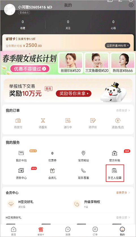 1、在河狸家我的页面点击“手艺人招募”