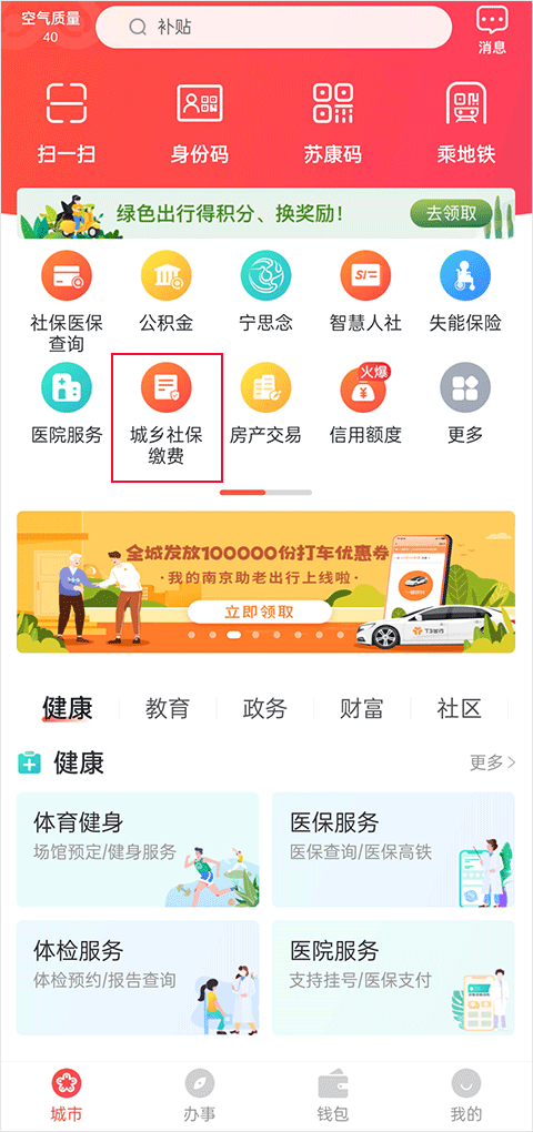 1、首先打开我的南京,在首页点击城乡居民社保;