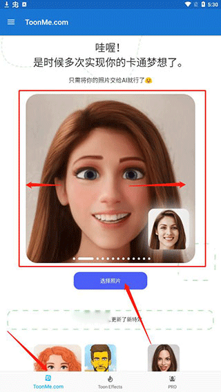 1、成功下载安装之后打开应用,可以左右滑动选择一个喜欢的toonme特效,然后选择照片;