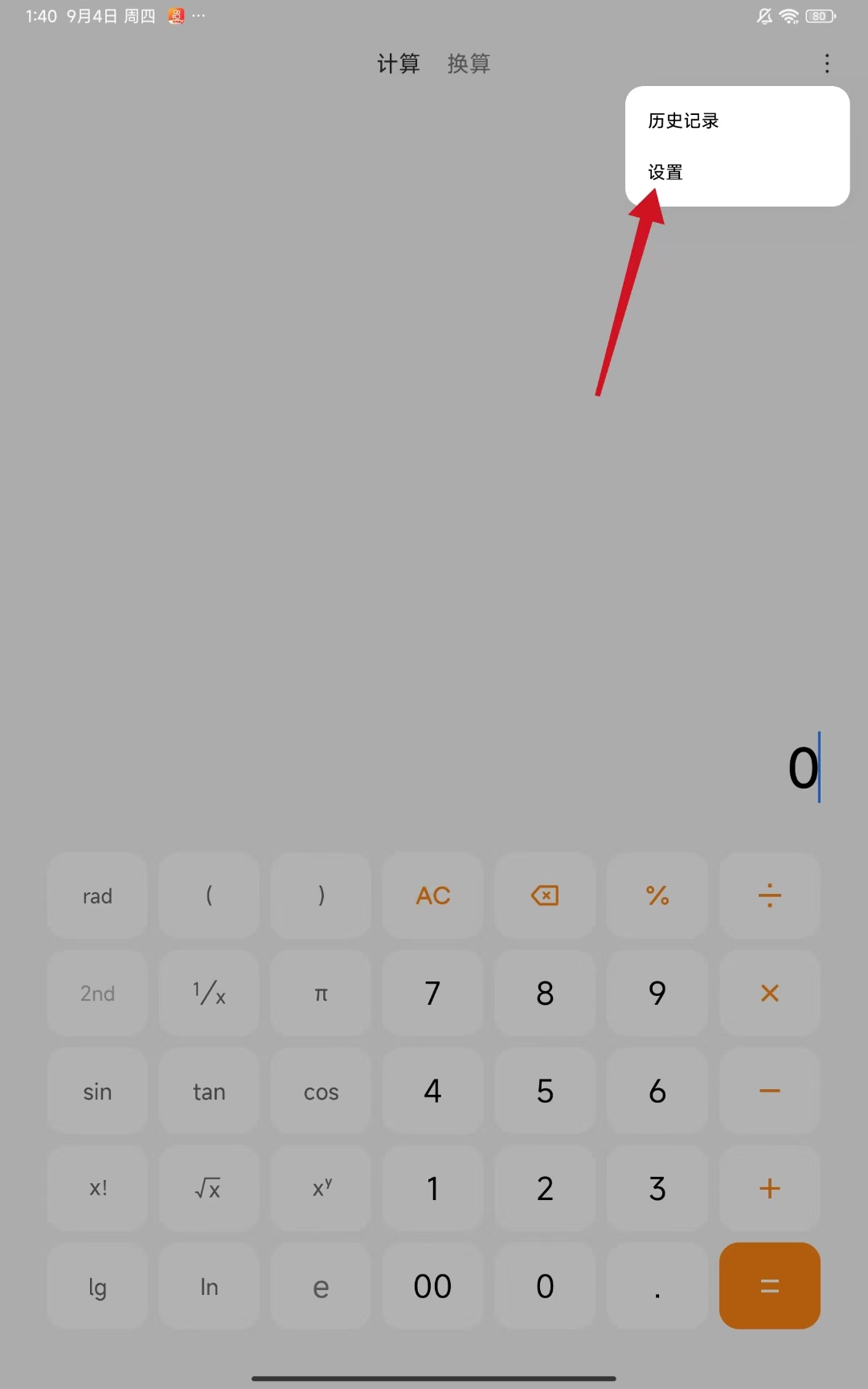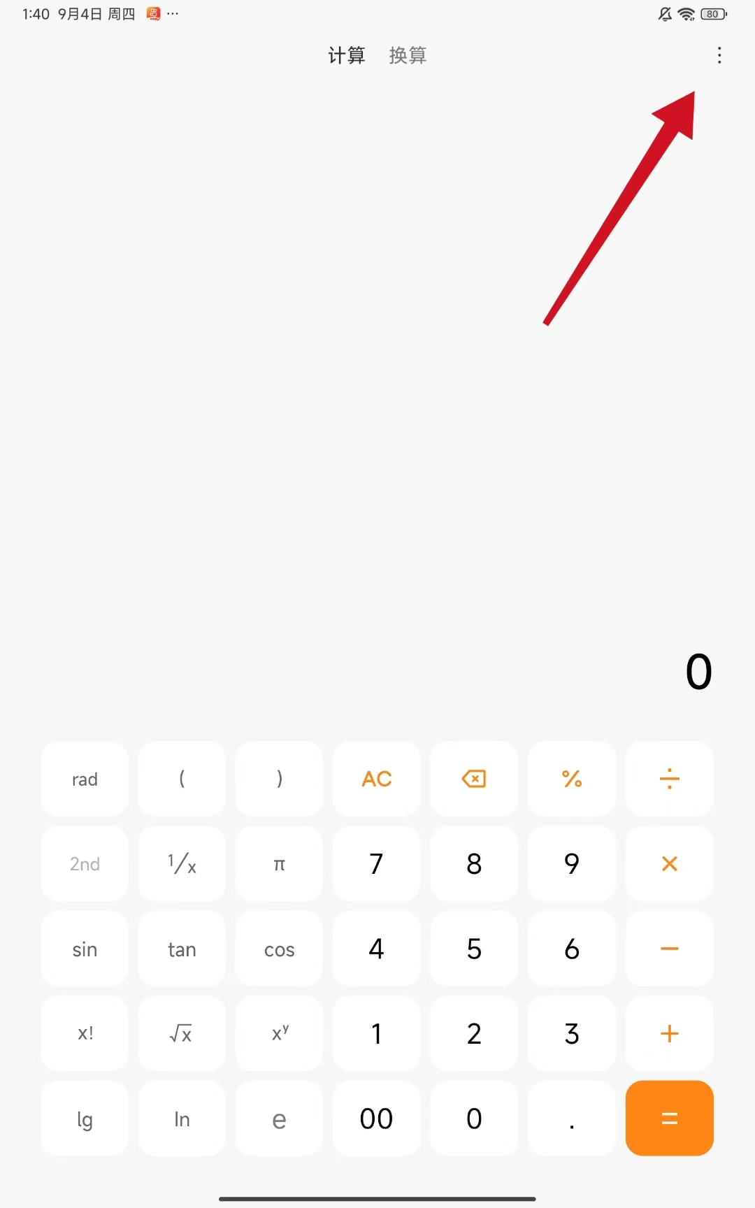 1、打开小米手机中的计算器应用,点击界面右上角的三点图标,打开更多选项。