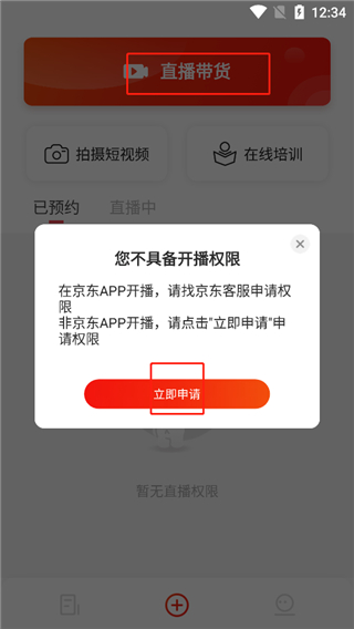 1、当点击进入软件主页,选择直播带货,弹跳出开播权限后,点击立即申请;