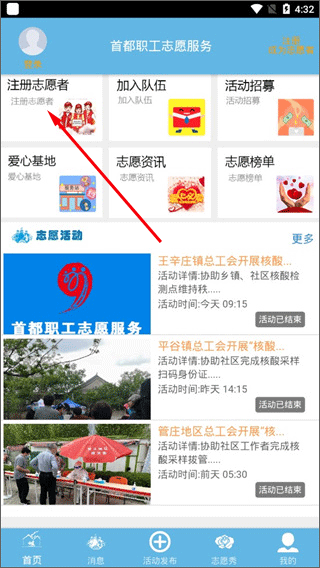 2、在首页我们可以看到志愿活动,以及志愿资讯、爱心基地等服务,点击“注册志愿者”;