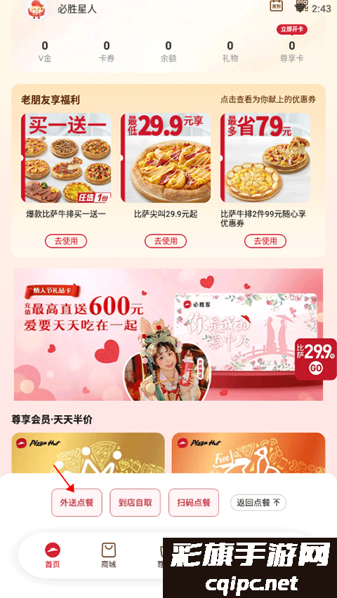 1、打开手机的必胜客软件,点击外送点餐选项。