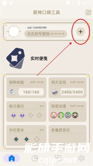 1、进入原神口袋工具app的主界面后,点击右上角的“+”号;