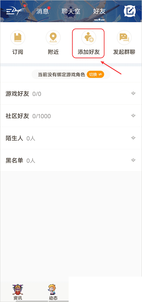 1、打开DNF助手app,点击底部“聊天”界面,点击“添加好友”;