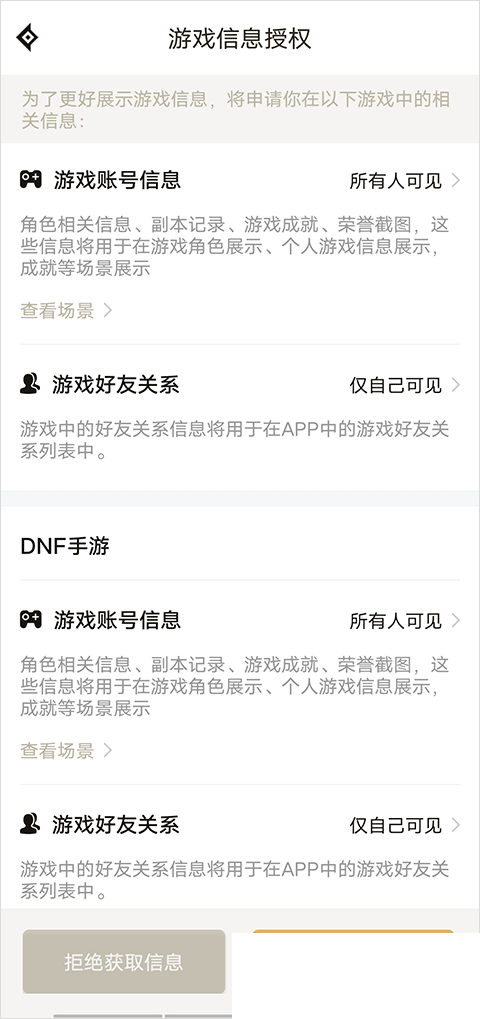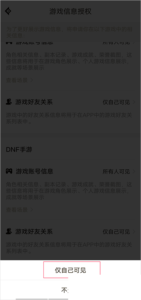 4、进入游戏信息授权界面后,点击游戏账号信息右侧的所有人可见选项。