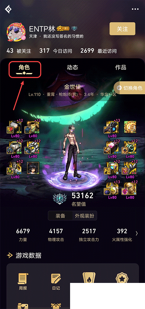 2、在用户动态界面中点击角色选项,即可看到别人角色的信息。