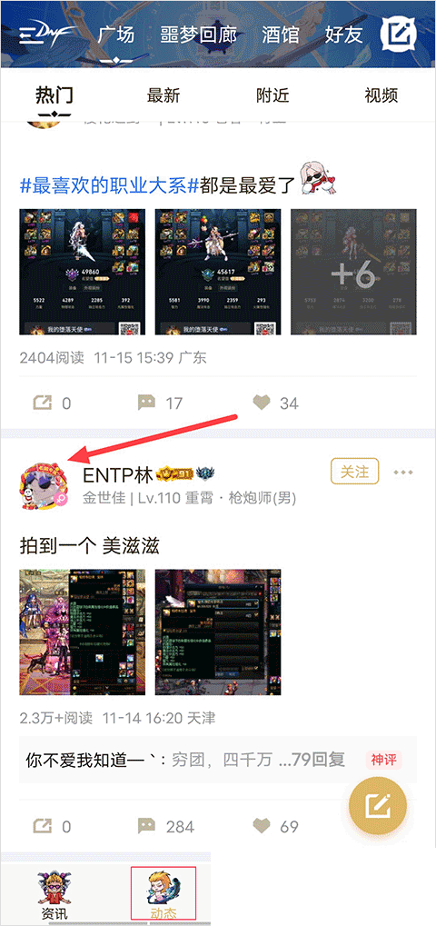1、在动态界面,点击发布动态的用户的头像进入用户动态界面。