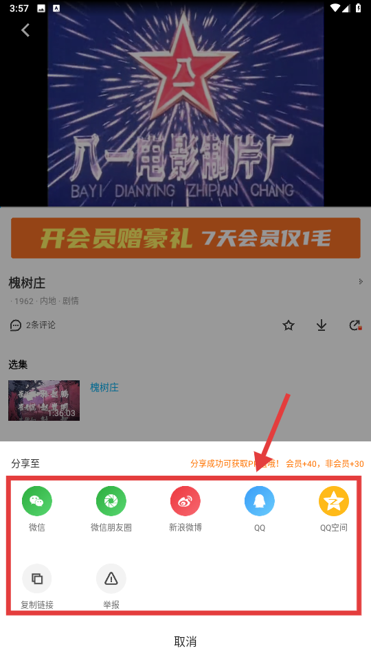 4、在分享平台列表中选择任意平台(如【微信】【微信朋友圈】【新浪微博】等),完成影片分享操作。