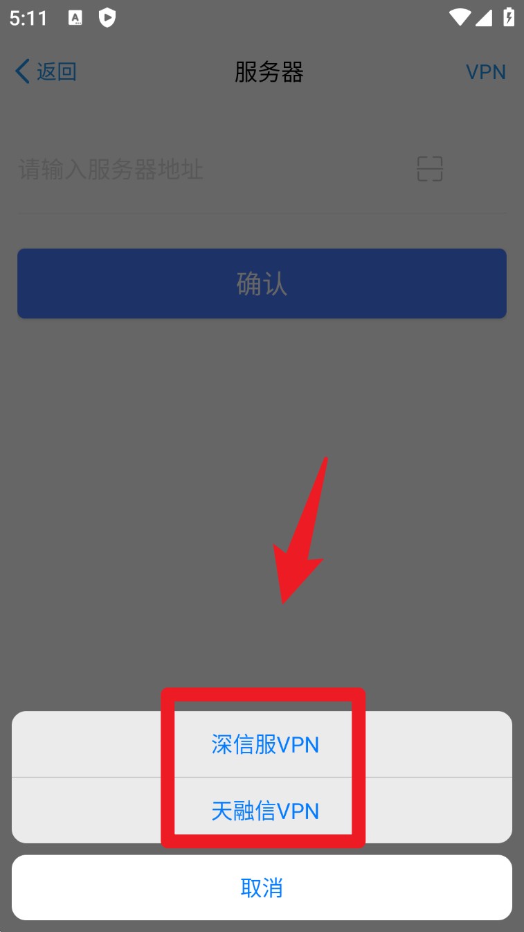 2. 输入地址后,点击右上角“VPN”按钮,选择对应的 VPN 类型进行连接。
