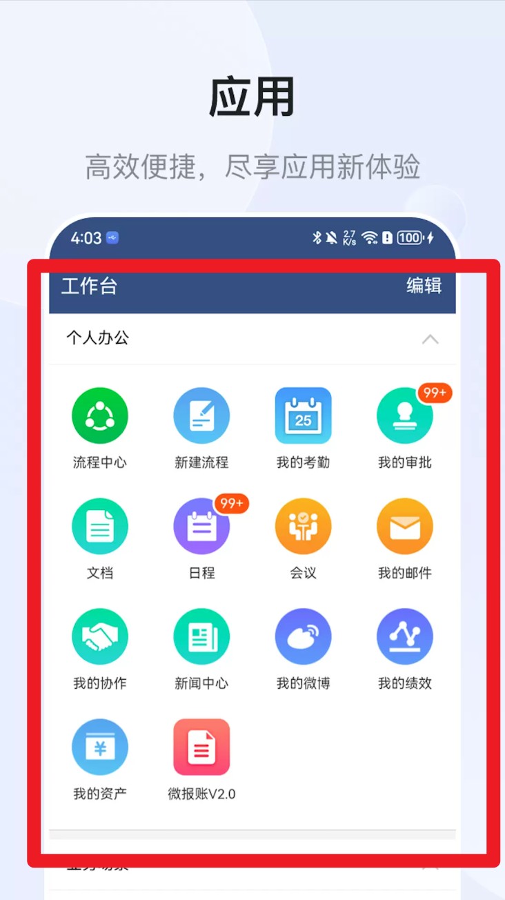 5. 多个模块划分清晰,常用的审批、考勤、日报表都放在首页,操作效率高。