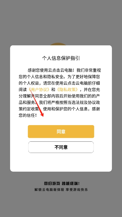 2、进入后阅读并同意云点击云电脑app的用户协议