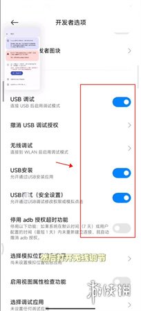 4、在开发者选项中,按照图示将相关开关进行设置,并点击“无线调试”。