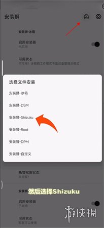 9、打开安装狮,点击右上角的“安装”按钮,选择“安装狮-Shizuku”。