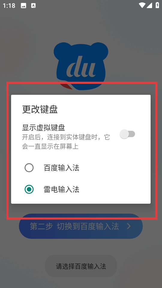 3、更改键盘弹窗切换手机当前输入法,选百度输入法完成切换,这是让其成为默认输入方式的关键环节。