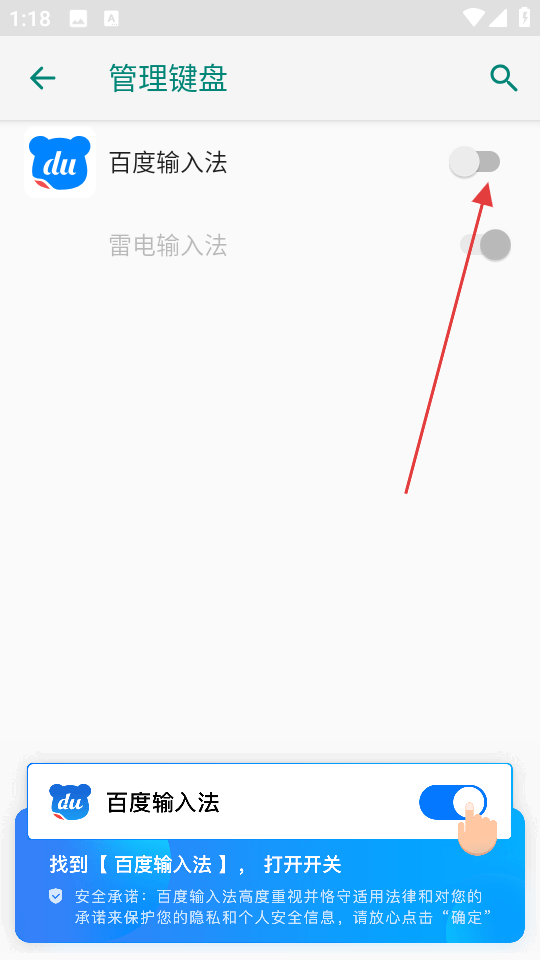 2、管理键盘设置界面管理已安装输入法,找到百度输入法开启开关,使其在手机输入场景可用,这是配置关键步骤。