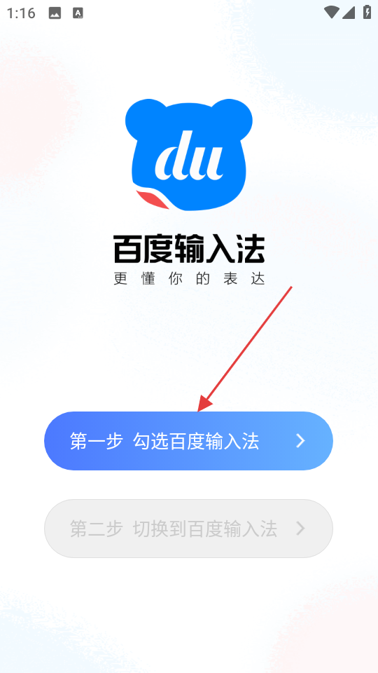 1、APP 设置引导界面下方有两步设置流程,先勾选百度输入法按钮,点击后进入系统输入法勾选页面,将百度输入法设为可用。