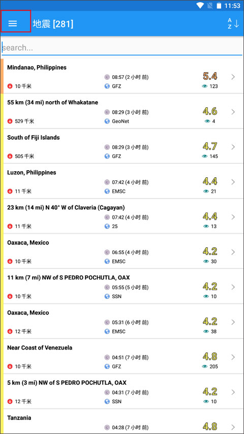 1、打开app之后默认进入到【地震】界面,点击左上角的三横图标。