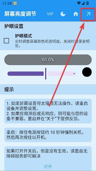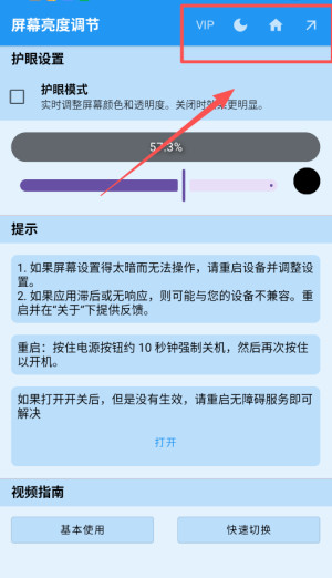 1、下载后打开屏幕亮度调节器专业版应用主界面可以看到亮度护眼提示等核心功能模块直接点击就能快速进入设置页面。