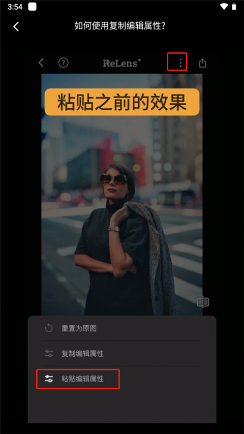 4、再次,点击三个点,然后粘贴编辑属性,即可对第二张图片进行之前图片的属性编辑后的效果。