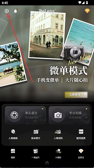 1、打开relens软件,在首页点击左上角齿轮按钮