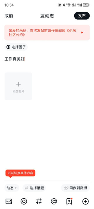 3、输入你想发的内容,支持选择圈子、话题等等。