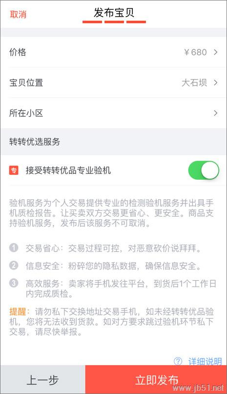 5、卖手机可以勾选转转的优品验机服务卖的比较快,优品验机更加安心。如果发布的是手机以外的东西,就没有“支持优品验机”这个选项。之后只要填清楚价格什么的就可以发布了。