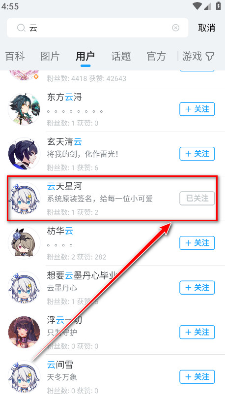 3、找到好友的账号,然后点击加关注即可。