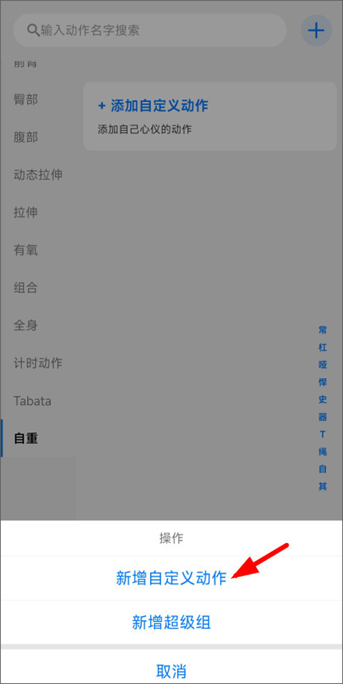 4、在动作页面中左侧肌肉部位栏下拉至自重,点击添加自定义动作。