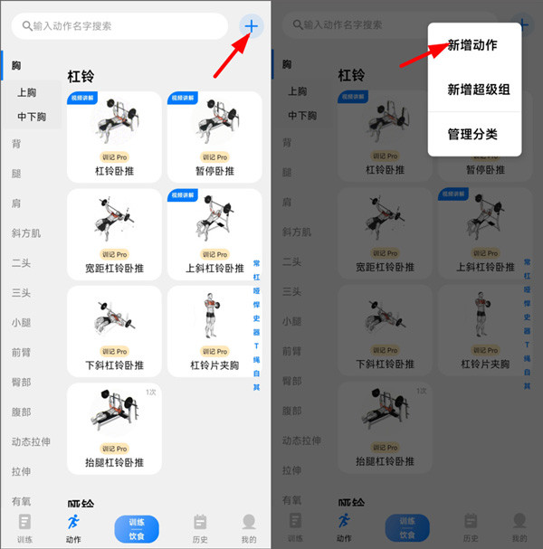 2、打开锻炼动作,用户可以看到很多不同的运动动作,点击右上角“+”,下拉里选择新增动作。