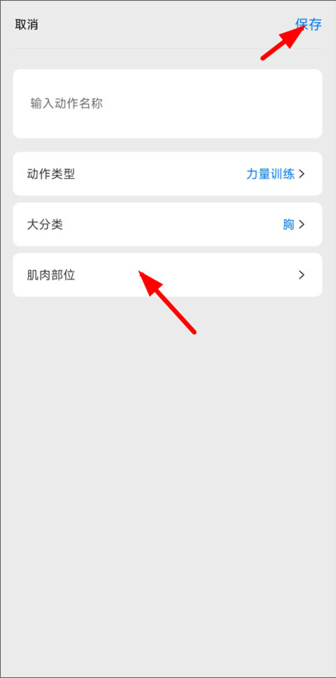 3、进入新增动作页面,用户输入动作名称,选择类型、分类、部位等,点击右上角保存。