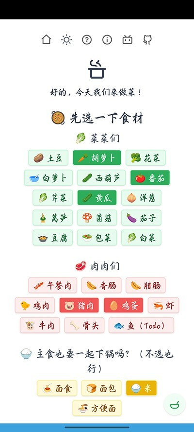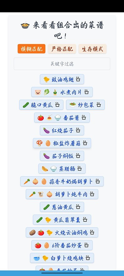 4、生成的菜谱一共分为三个模式:模糊匹配、严格匹配、生存模式;