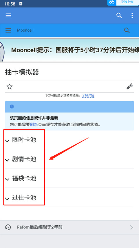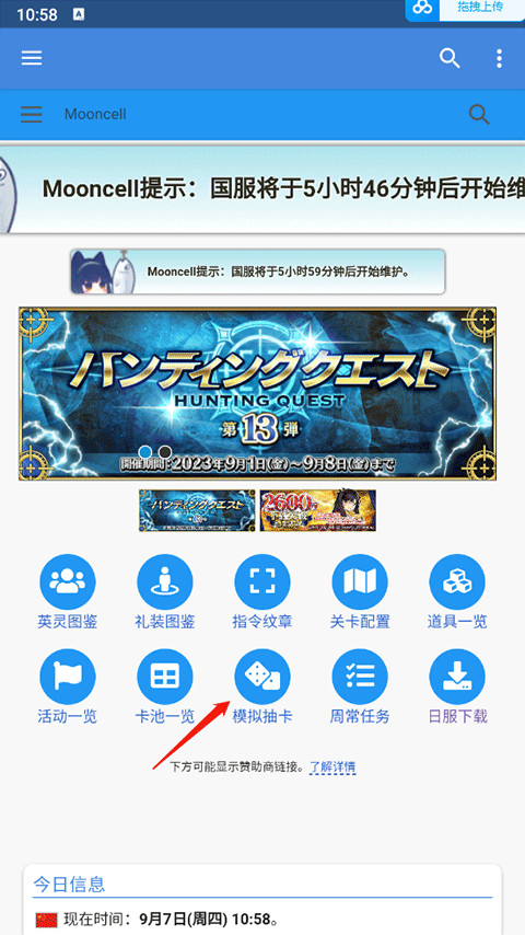 1、在FGOwikiMooncell首页上点击模拟抽卡。