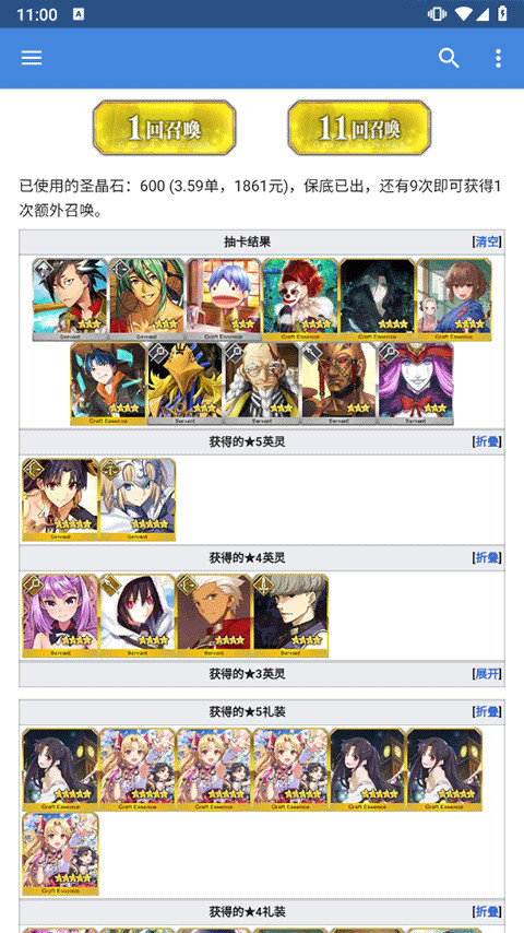 4、在模拟抽卡界面中你可以直接点击1回和11回召唤进行抽卡,也可以在输入你自己的预算来模拟抽卡。