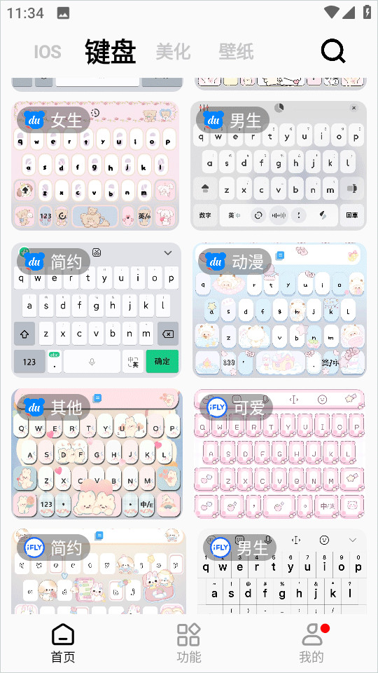 2、还提供了各种键盘、如ios、可爱、男生、女生等等供你选择;