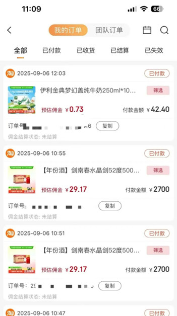 2、上面图片就显示了商品的价格以及返利的金额。点击分享就能生成分享图片和链接,可以分享给他人使用,也可以复制链接,然后打开相应购物平台,自己购买使用。点击自购就会跳转到相应的购物平台,下单购买后就会有相应的返利。返利订单信息如下图。