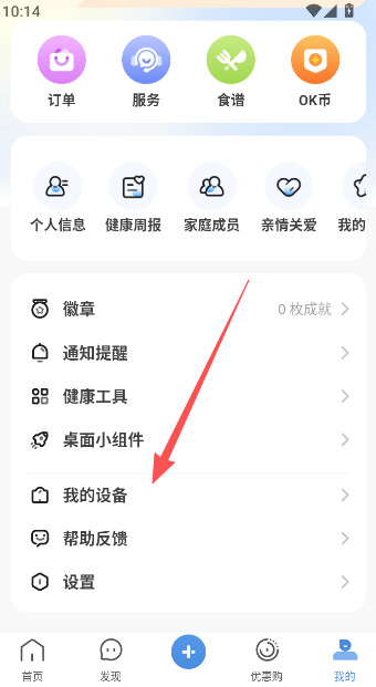 1、在okok体脂秤的用户页面,点击我的进入我的设备功能选项。