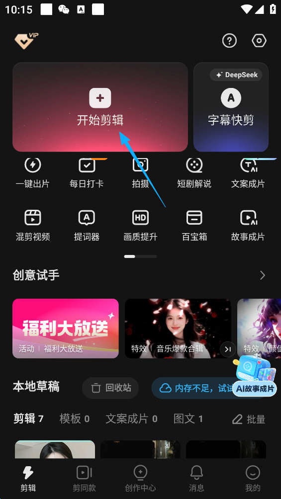 1、打开快影视频剪辑客户端,选择下方的剪辑在点击“开始创作"。