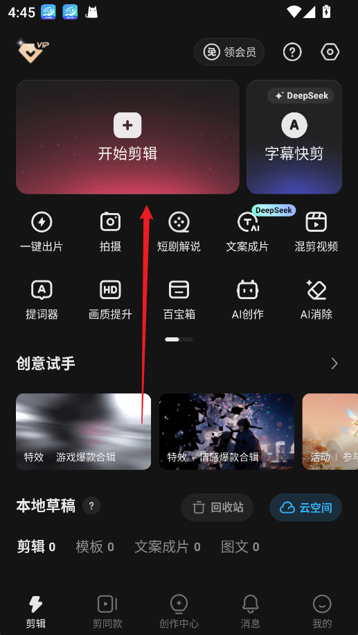1、点击快影视频剪辑客户端屏幕左上方的“开始剪辑”。