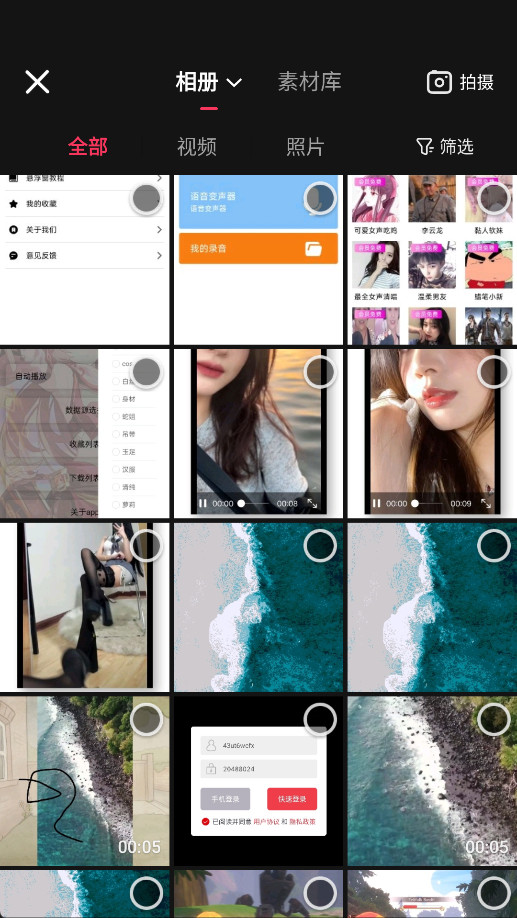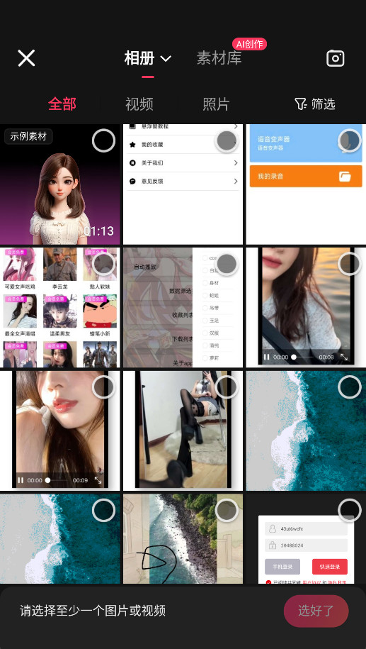 2、从相册选择视频/图片→ 勾选多段素材→选好了。
