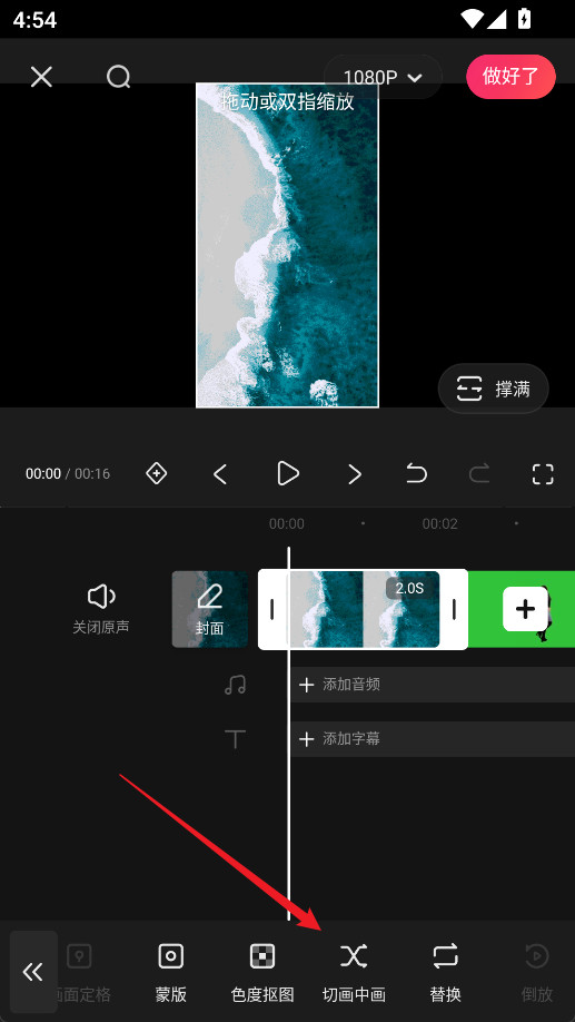 点击“裁剪”→ 选择画幅比例(如9:16竖屏、16:9横屏)→ 去除多余边框。