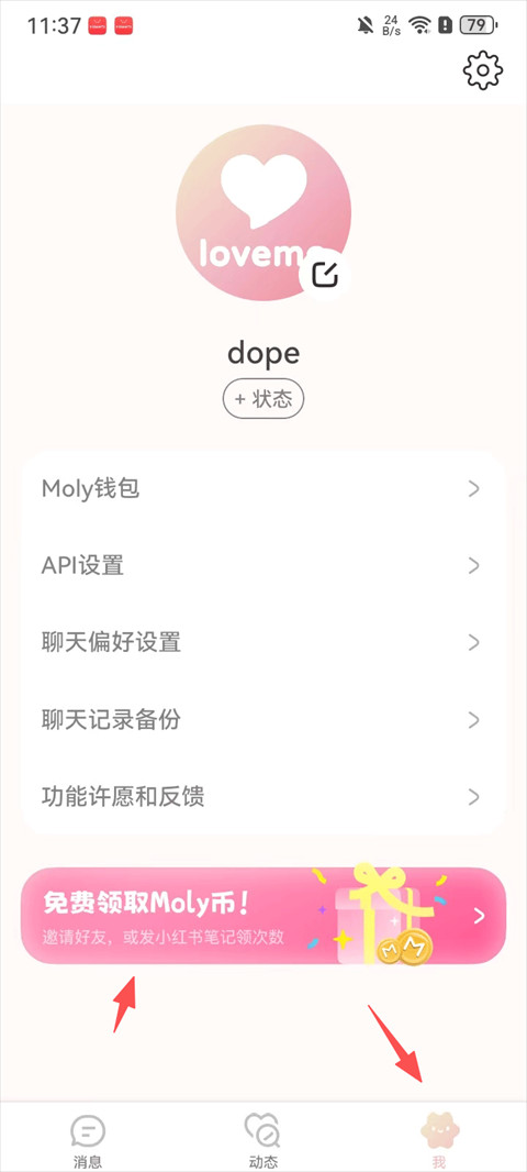 1、点击lovemo聊天设置页的“免费领取Moly币”活动入口;